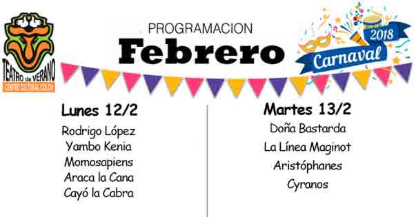 Carnaval 2018 en el Teatro de Verano de Colón. Programación completa para el viernes 9 y domingo 11 de febrero.